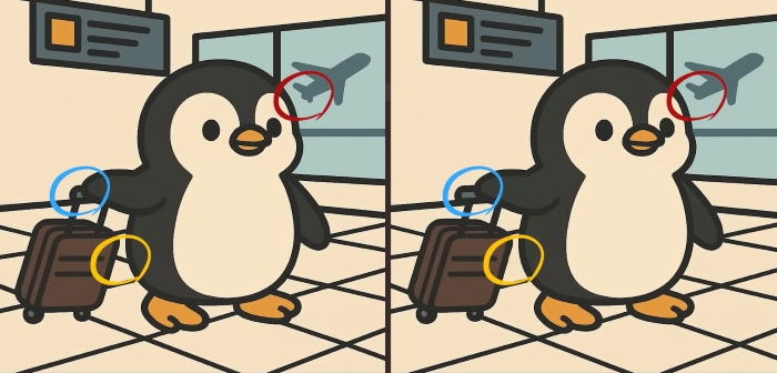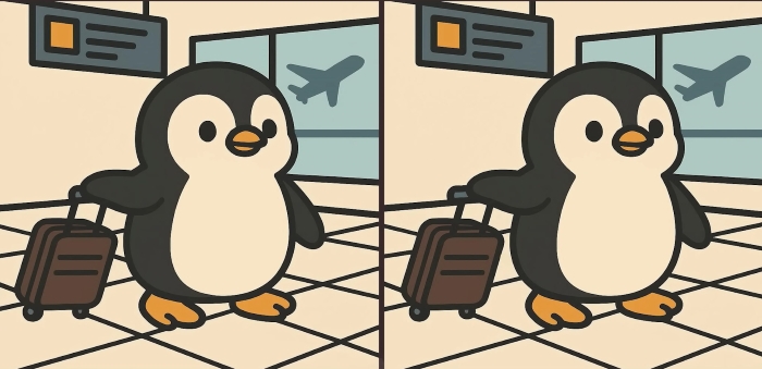 Είστε λοιπόν έτοιμοι για την επόμενη πρόκληση; Ρίξτε μια προσεκτική ματιά σε δύο εικόνες ενός χαριτωμένου πιγκουίνου που μεταφέρει αποσκευές στο αεροδρόμιο. Μπορεί να φαίνονται πανομοιότυπες με την πρώτη ματιά, αλλά κρύβονται πάνω τους 3 μικρές διαφορές. Πιστεύετε ότι μπορείτε να τις βρείτε όλες σε 61 δευτερόλεπτα; Δοκιμάστε το και δοκιμάστε την οπτική σας οξύτητα!
