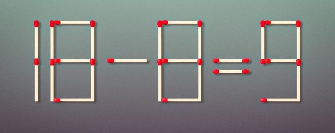 Παρακάτω θα δείτε μια εικόνα όπου η ισότητα 18-8=9 είναι τοποθετημένη με τη βοήθεια σπίρτων. Προφανώς, είναι μαθηματικά λανθασμένη, διότι η διαφορά αυτών των αριθμών θα έπρεπε να είναι 10.