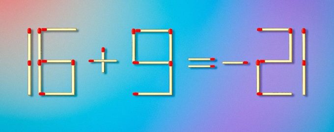 Στην εικόνα – μια λανθασμένη ισότητα που αποτελείται από 26 σπίρτα: 16 + 9 = -21. Ο στόχος σας είναι να σύρετε μόνο ένα από αυτά για να κάνετε την ισότητα σωστή.