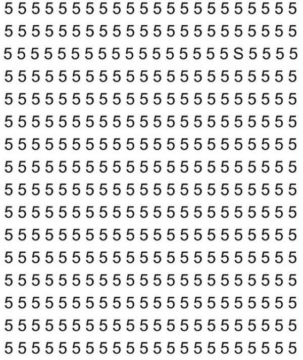 Στην εικόνα βλέπουμε πολλά ψηφία 5, τα οποία είναι τοποθετημένα σε σειρές και στήλες. Αν κοιτάξετε αυτή την εικόνα, από τα πρώτα δευτερόλεπτα μπορεί να φαίνεται ότι σίγουρα δεν υπάρχει πουθενά το γράμμα S. Αλλά αυτή η πρώτη εντύπωση δεν πρέπει να είναι εμπιστευτική – υπάρχει σίγουρα, απλώς δεν είναι τόσο εύκολο να το παρατηρήσετε.