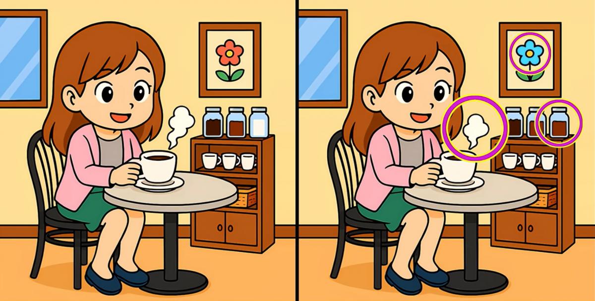 Λοιπόν, είστε έτοιμοι για την επόμενη εργασία; Ρίξτε μια προσεκτική ματιά σε δύο εικόνες ενός κοριτσιού που πίνει καφέ. Μπορεί να φαίνονται πανομοιότυπες με την πρώτη ματιά, αλλά υπάρχουν 3 μικρές διαφορές. Πιστεύετε ότι μπορείτε να τις βρείτε όλες σε 19 δευτερόλεπτα; Δοκιμάστε το και δοκιμάστε την οπτική σας οξύτητα!